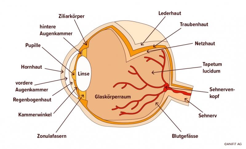 Eine markante Eigenheit sind die «funkelnden» Augen von Katzen und Hunden. Dafür verantwortlich ist das Tapetum lucidum (lat.: «leuchtender Teppich»). Dabei handelt es sich um eine reflektierende Schicht, die sich hinter der Netzhaut befindet. Trifft Licht auf diese Schicht auf, wird es reflektiert und ein zweites Mal durch die Netzhaut geleitet. Das Licht wird sozusagen „verdoppelt“ und ermöglicht dem Tier, auch in der Dämmerung und bei schlechten Lichtverhältnissen zu sehen.