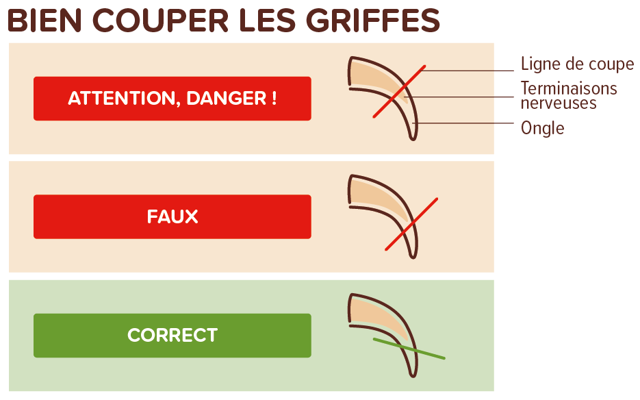 Il est préférable de couper les griffes plusieurs fois et de ne prendre que l'extrémité avant de l'ongle. En cas d'urgence, gardez un chiffon propre à portée de main afin que le sang, qui jaillit abondamment, ne soit pas aspergé partout. En cas d'urgence, votre vétérinaire peut vous aider.