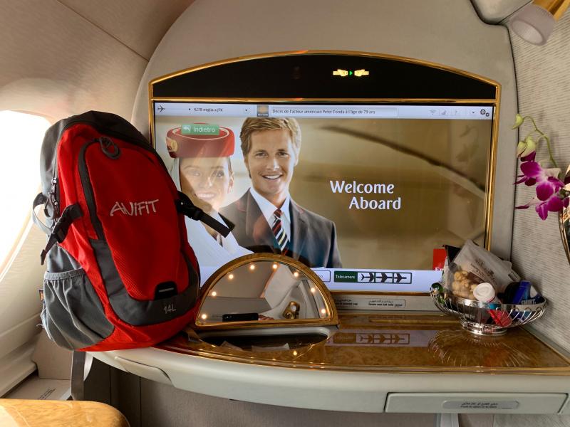 Avec un si joli sac à dos, seulement le mieux : Première Classe Emirates à 360 degrès!