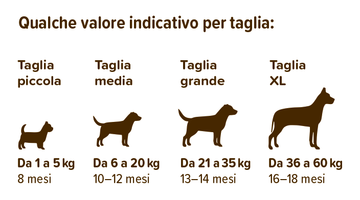 Più il caneè  di taglia piccola, più rapidamente cresce e si può passare all’alimentazione per adulti.